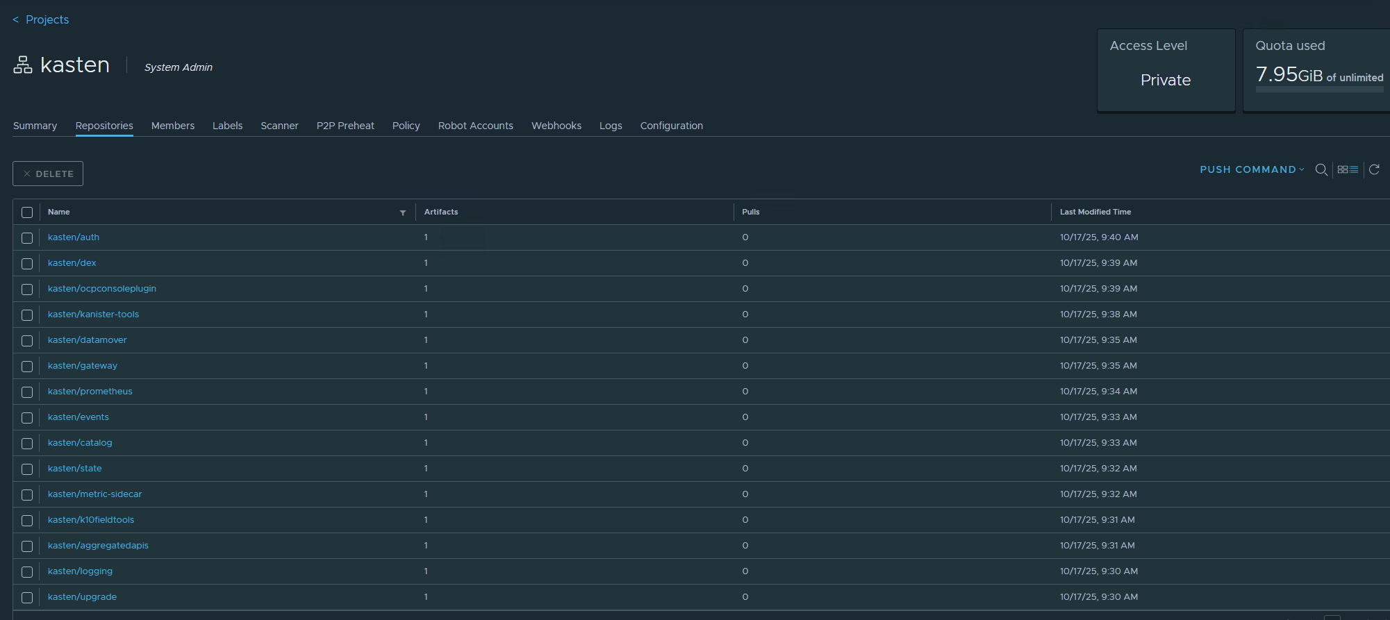 This pulls all necessary images from Kasten’s remote repository and pushes them to our local Harbor registry.