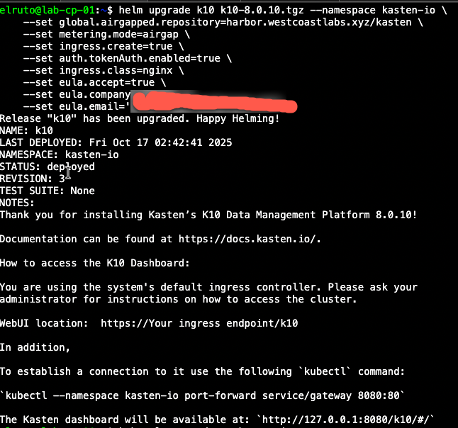 helm upgrade k10 k10-8.0.10.tgz --namespace kasten-io \