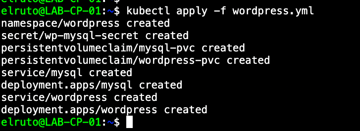 First up, let’s deploy WordPress. I’ve created a YAML file to automatically deploy WordPress and a MySQL pod into a namespace called wordpress. This will automatically be exposed via the MetalLB load balancer so we can access it externally. I’ve also added the wordpress.yml file to my GitHub repo so you don’t have to try copying and pasting it from the blog.