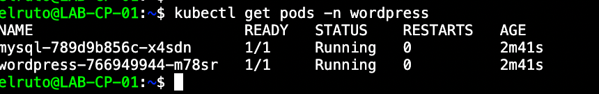As mentioned, this will automatically deploy both WordPress as well as MySQL in a single namespace. We can verify this by checking the namespace - you should see two pods running.