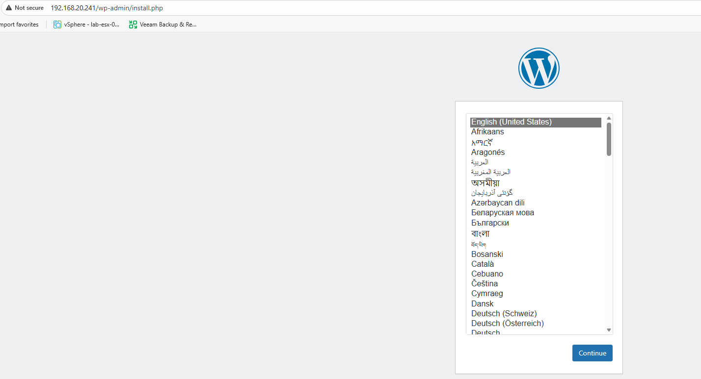 Perfect! At this point, you should be able to navigate to the WordPress installation wizard using the external IP that MetalLB assigned. Go ahead and set up WordPress with some test data - we’ll be using this to verify our backups work correctly later on.
