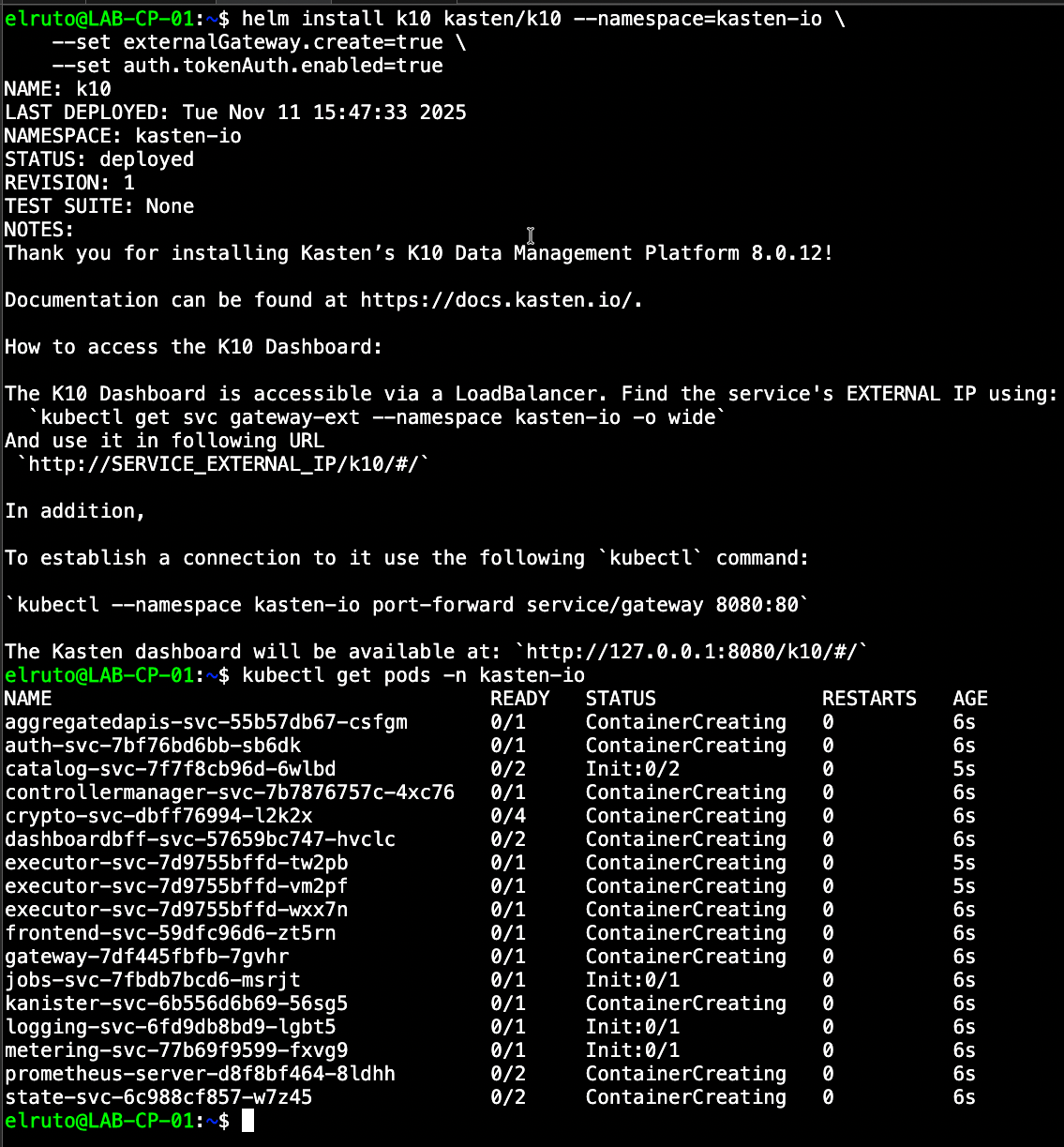 Hopefully at this point we’ve done everything correctly and it’s all showing green OK status, which means we’re finally ready to install Kasten. Drum roll please…