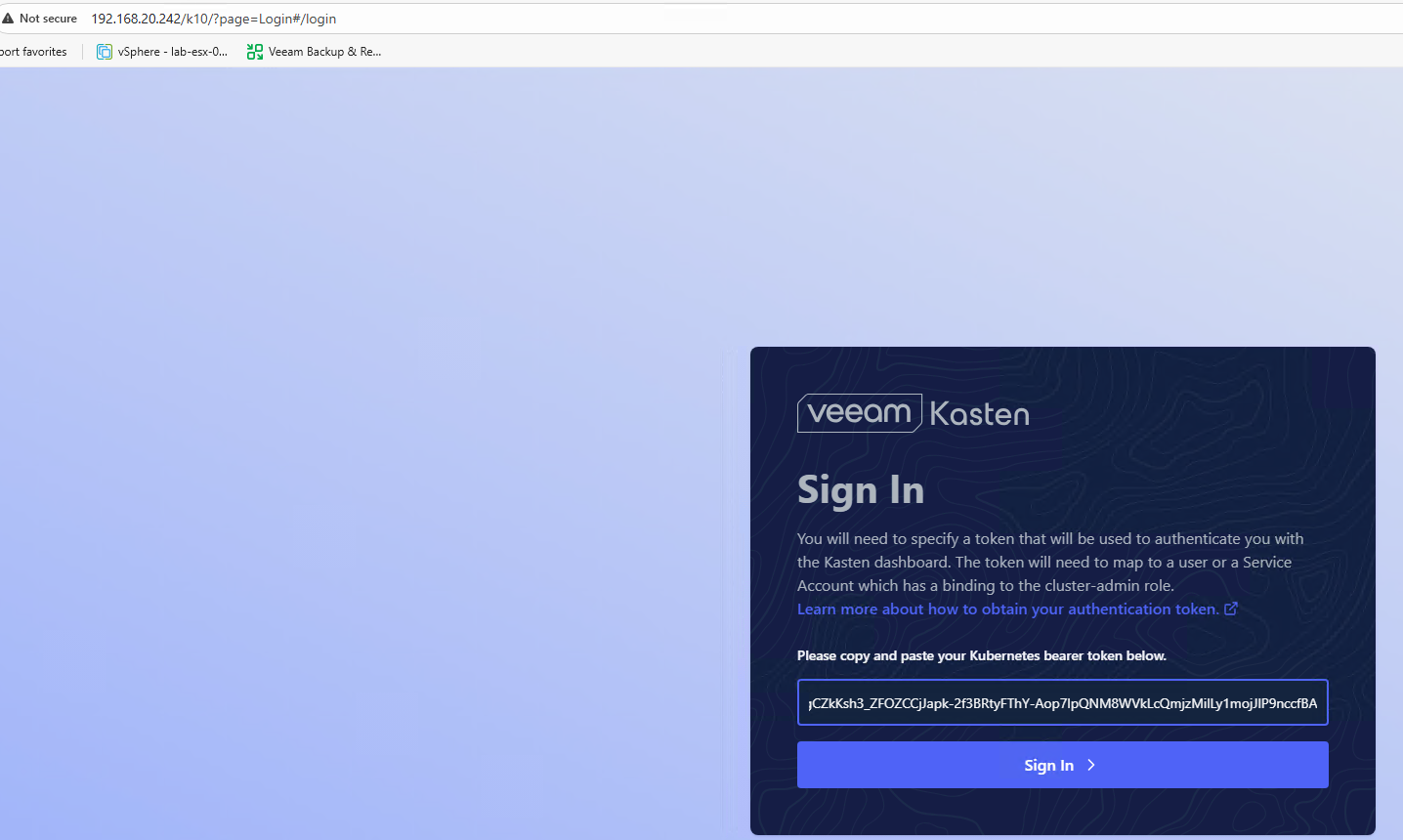 Copy that token and navigate to the Kasten dashboard using the external IP assigned by MetalLB. You’ll be greeted with the login screen where you can paste your token and gain access to the beautiful Kasten UI.