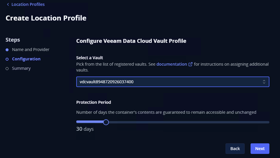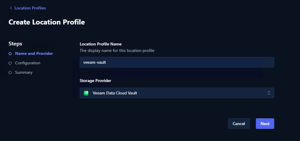 Home stretch! We’re at the final steps. First, we’ll need to create a location profile, otherwise known as a place to store our backups. Just to be a bit fancy, I’ll use Veeam Data Cloud Vault as my location profile, which is now built right into the UI, so it makes it nice and simple.