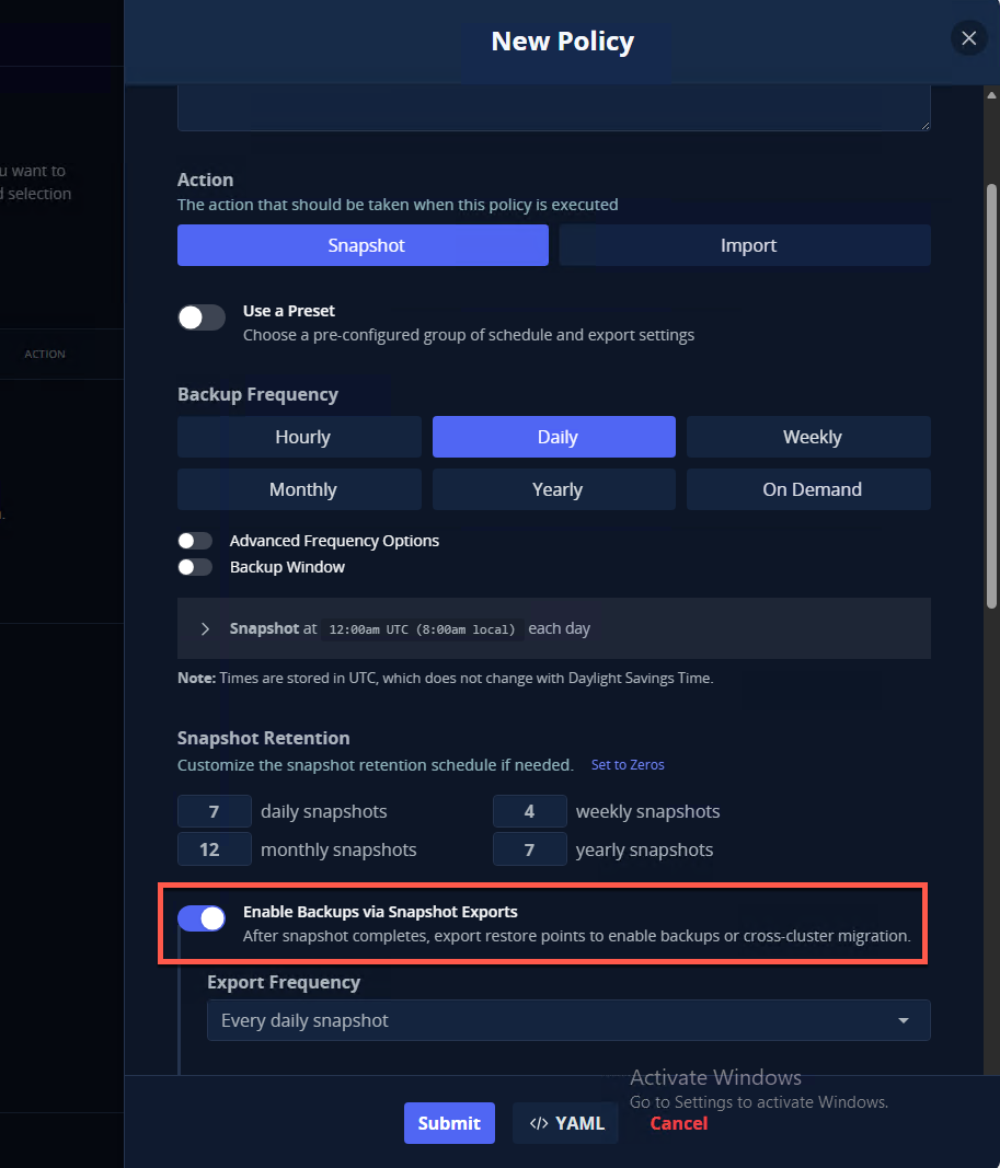 This will launch the New Policy Wizard. Follow the bouncing ball, making sure to select “Enable Backups via Snapshot Export” - this is what allows us to export our backups to the location profile we created earlier.