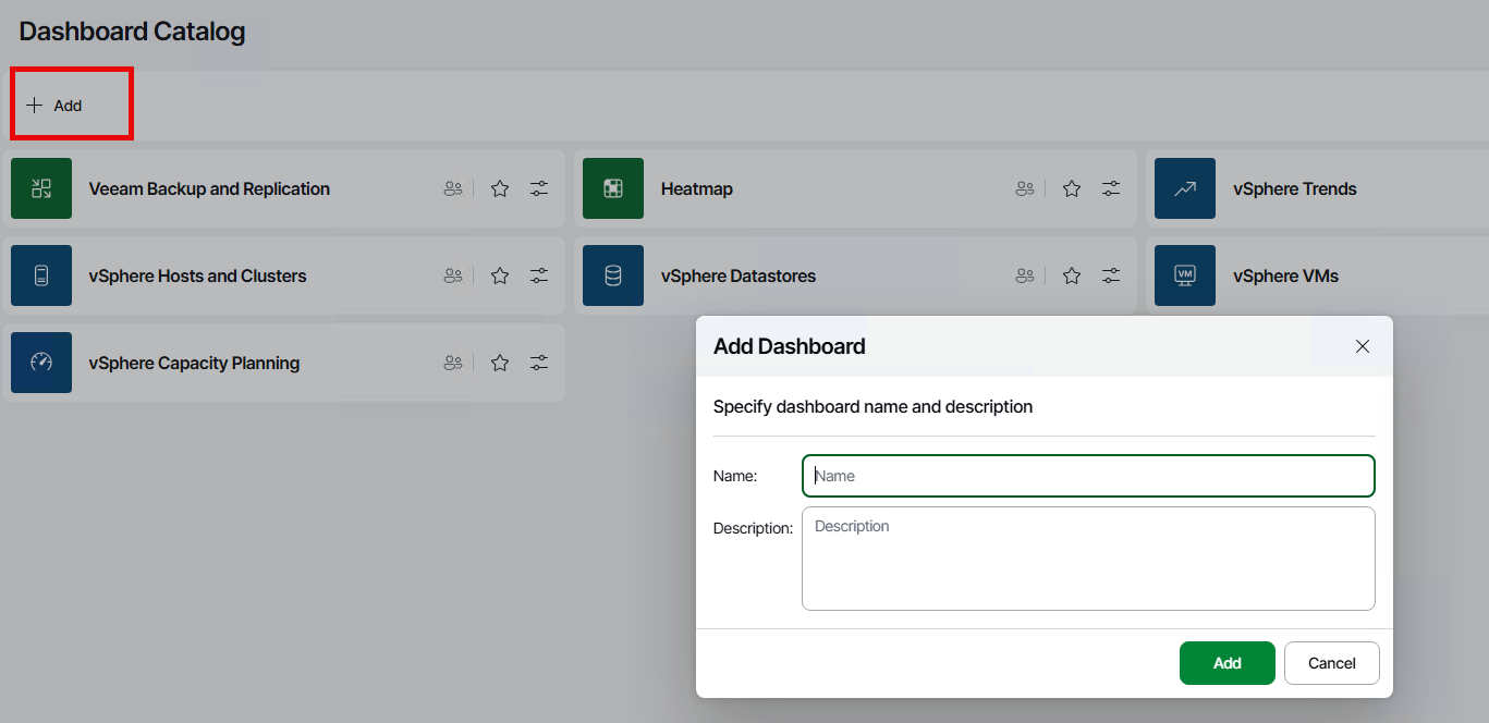 Once this is done, we can go back and open the dashboard tab. This will show us a bunch of pre-created dashboards based on what we have mapped, which in my case is VBR and vCenter.