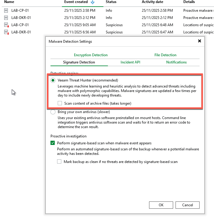 - Navigate to the Signature Detection tab and confirm Veeam Threat Hunter is enabled