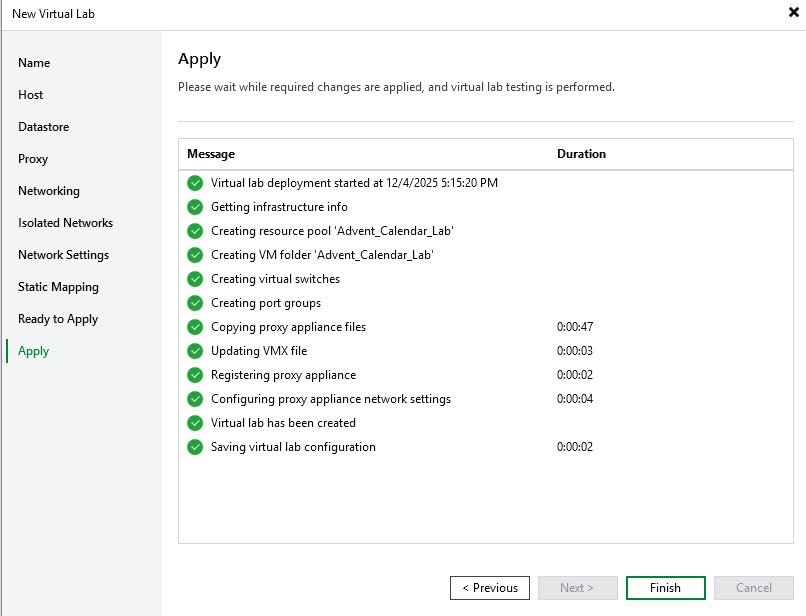 And there we have it! We’ve successfully set up the foundational infrastructure for SureBackup—the virtual lab and application groups. These are the building blocks that make automated backup verification possible.