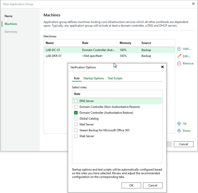Some services we want to test may require auxilary services like Active Directory or DNS so to account for that we can create an application group, as the same suggests this allows us to group all the workloads together that make up that application so lets for instance you require AD, SQL and your web front end, we can combine those together in an application group, booth them in the right order and verify that the application is up and usable.