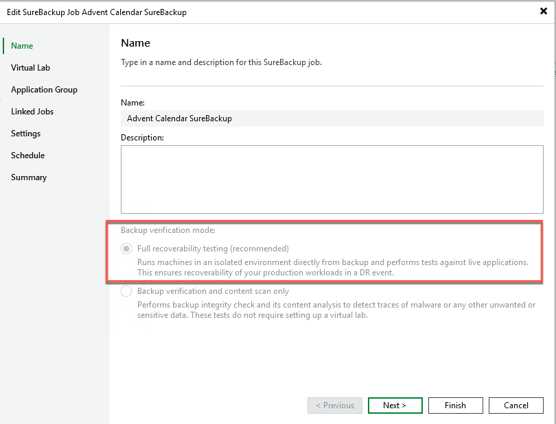 - SureBackup can operate in two modes: Full Recoverability (which is what we’re doing here), which basically means we’re spinning up the workload in an isolated environment, running custom scripts against it, and even leaving the workload powered on for custom End User Acceptance testing. Whereas with Backup Verification (or SureBackup Lite, as I like to call it), we’re mounting the backup file from our backup repository, which allows us to scan and verify the backup—this includes malware and content scanning. This lite option doesn’t require the pre-created infrastructure, considering we aren’t actually spinning up the workload.