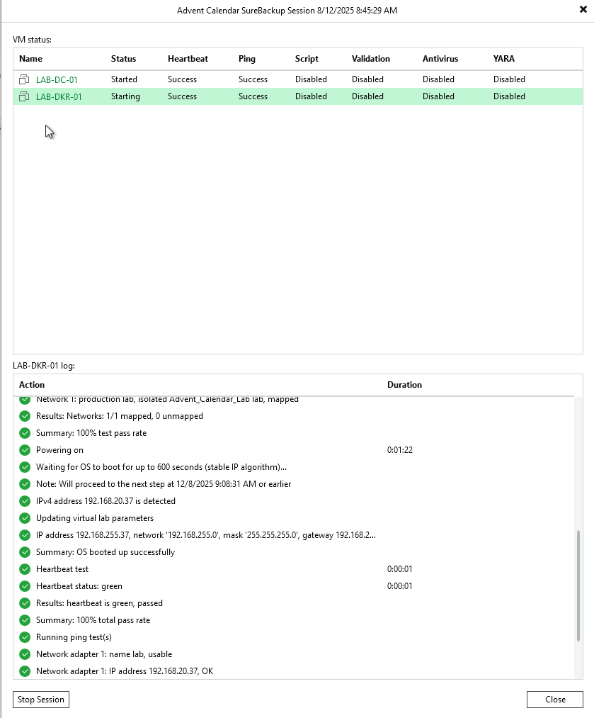 And there you have it, a complete SureBackup implementation from start to finish! Over these two days, we’ve built the infrastructure, configured the verification tests, and created an automated system that continuously validates your disaster recovery readiness.
